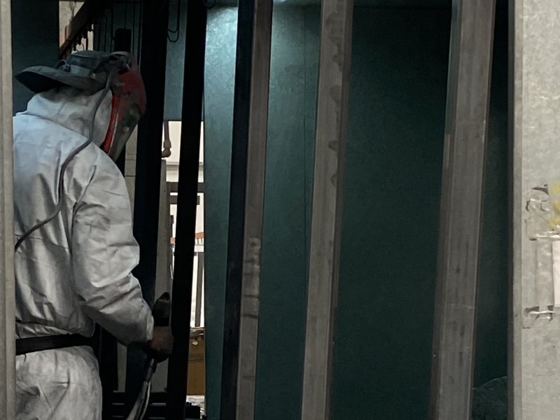 In the second area we have a water-wash free standing booth with a 3.5 metre working aperture; here we etch prime and offer conventional wet paint spraying and air drying.